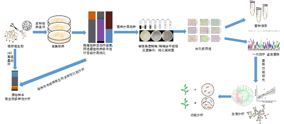 高通量分離培養(yǎng)技術(shù)解決了土壤和植物微生物群落研究中無法系統(tǒng)地分離培養(yǎng)微生物群落的局限,獲取根際土壤中的大量微生物菌株。本實驗對于根際微生物的非靶向分離培養(yǎng),通過多種培養(yǎng)條件富集培養(yǎng)、有限梯度稀釋、96孔板培養(yǎng)分離菌株、四區(qū)劃線純化菌株、高通量測序、菌株鑒定等技術(shù),從而得到客戶需要的菌株,同時可進行后續(xù)菌株相關(guān)功能的研究。