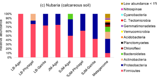本研究使用改進的培養(yǎng)依賴型和培養(yǎng)獨立型方案,詳細描述了對比土壤條件下小麥根際微生物組的特征。證明,培養(yǎng)基制備的改進(在培養(yǎng)基制備過程中對磷酸鹽和膠凝劑進行單獨滅菌)和使用替代固化劑可有效提高與小麥根際相關(guān)的細菌群落的可培養(yǎng)性。我們認為,應(yīng)該并行應(yīng)用不同的培養(yǎng)策略,以將更多的細菌帶入培養(yǎng)中并發(fā)現(xiàn)新的PGPR候選者,它們是未來可持續(xù)農(nóng)業(yè)的關(guān)鍵參與者。未來的研究需要評估它們在受控和田間條件下促進植物生長的效率。使用各種培養(yǎng)方案恢復(fù)的細菌群落多樣性明顯低于使用獨立培養(yǎng)方法獲得的細菌群落多樣性;因此,需要結(jié)合兩種方法來提供對土壤微生物組的更深入的了解,并揭示與植物健康和生產(chǎn)力相關(guān)的培養(yǎng)和未培養(yǎng)的細菌。