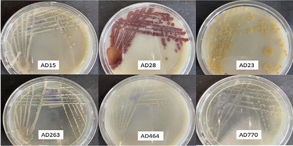 不同鹽田中分離出的嗜鹽菌的純培養(yǎng)物
