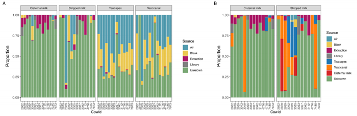 《The impact of kit, environment and sampling contamination on the observed microbiome of bovine milk》的研究以14頭健康奶牛為對象,采集腺泡乳、剝離乳、乳頭頂端、乳頭管樣本,同時(shí)設(shè)置空氣空白、采樣空白、提取空白等多重陰性對照,通過兩種算法系統(tǒng)識別污染,其結(jié)果深刻揭示了低生物量樣本檢測的核心問題: