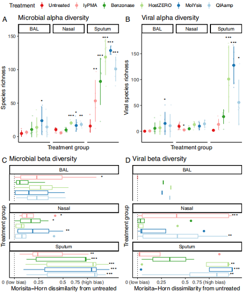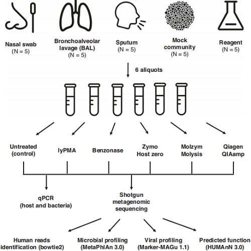 本研究對支氣管肺泡灌洗液(BAL)、鼻拭子、痰液三種呼吸道高宿主樣本,設(shè)置未處理對照組與5種宿主DNA去除處理組,同時(shí)設(shè)置模擬群落、試劑陰性對照,通過qPCR、宏基因組測序、微生物分型、功能預(yù)測等多維度分析,驗(yàn)證不同去除方法的效果。