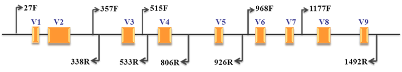 細(xì)菌核糖體RNA(rRNA)有三種類型:5S rRNA(120bp)、16S rRNA(約1540bp)和23S rRNA(約2900bp)。5S rRNA基因序列較短,包含的遺傳信息較少,不適于細(xì)菌種類的分析鑒定;23S rRNA基因的序列太長,且其堿基的突變率較高,不適于鑒定親緣關(guān)系較遠(yuǎn)的細(xì)菌種類;16S rRNA普遍存在于原核細(xì)胞中,且含量較高、拷貝數(shù)較多(占細(xì)菌RNA總量的80%以上),便于獲取模板,功能同源性高,遺傳信息量適中,適于作為細(xì)菌多樣性分析的標(biāo)準(zhǔn)。 16S rRNA編碼基因序列共有10個保守區(qū)和9個高可變區(qū)。其中,文獻(xiàn)中常用的區(qū)域是V1-V2,V3-V4,V4-V5等區(qū)域。