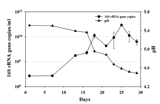 1.30天中,不同PH值對應(yīng)不同的16S rRNA基因拷貝數(shù)