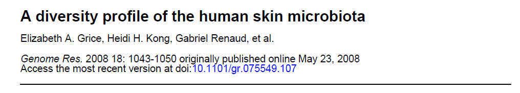 Grice, E. A., H. H. Kong, G. Renaud, A. C. Young, G. G. Bouffard, R. W. Blakesley, T. G. Wolfsberg, M. L. Turner and J. A. Segre (2008). “A diversity profile of the human skin microbiota.” Genome Research 18(7): 1043-1050.