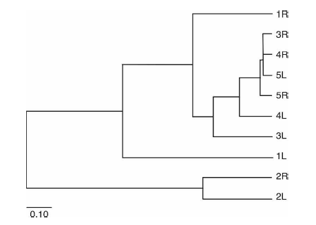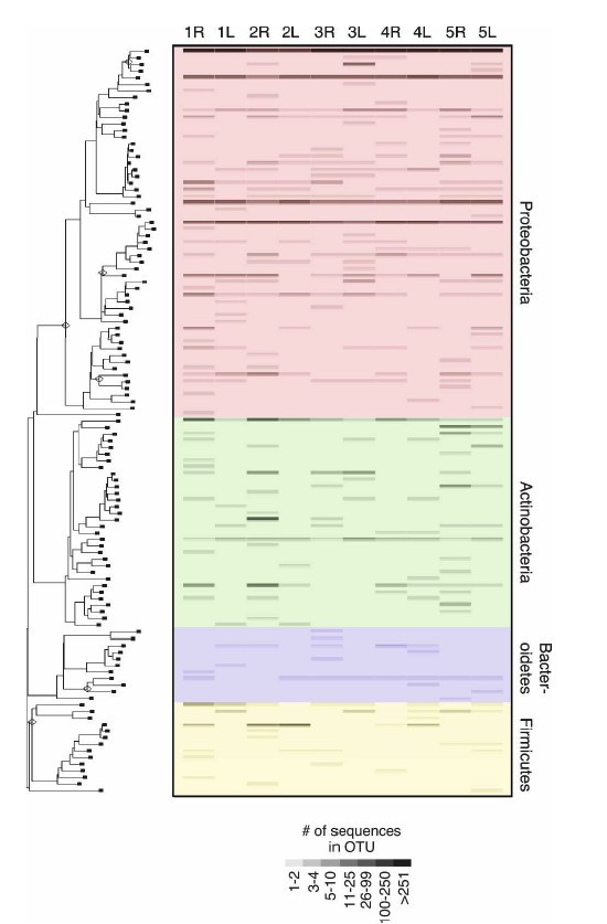 (1)無(wú)皮膚病史的五個(gè)樣本左、右手的113個(gè)OUT的系統(tǒng)發(fā)育樹結(jié)構(gòu)豐度