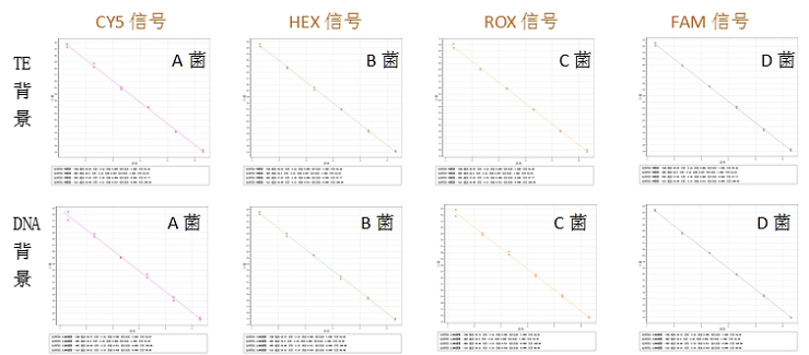 不同背景下CT值:在TE背景和人的基因組DNA背景下,針對(duì)A、B、C、D菌,四種熒光信號(hào)的標(biāo)準(zhǔn)曲線均呈現(xiàn)良好線性,擴(kuò)增效率在90%-110%之間,線性關(guān)系在0.999。試劑盒在復(fù)雜背景中可特異性檢測(cè)目標(biāo)微生物DNA,具有高準(zhǔn)確性、特異性和抗干擾能力。