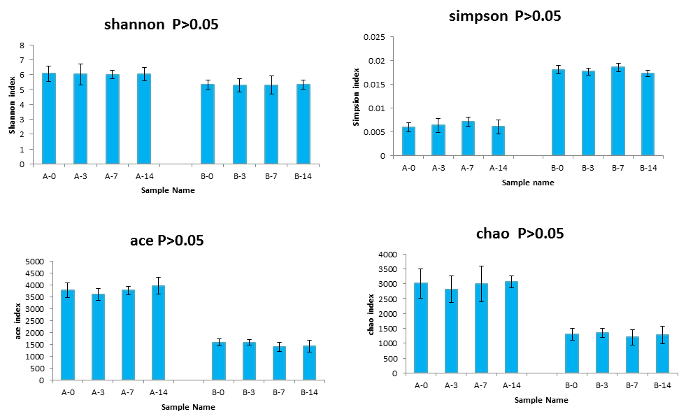 Alpha多樣性(Alpha diversity)是對單個(gè)樣品中物種多樣性的分析,其中shannon index和Simpson index是對物種richness進(jìn)行分析,ace和chao是對物種diversity進(jìn)行分析。