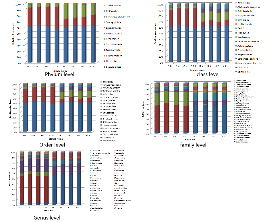 在門、綱、目、科、屬各水平的細(xì)菌相對豐度構(gòu)成圖中,每個(gè)柱子為一個(gè)處理三個(gè)重復(fù)的均值,不同顏色代表不同的物種,物種信息可見圖例,若某一種細(xì)菌占的比例多,則其在柱子中所占的比例就會(huì)更大。