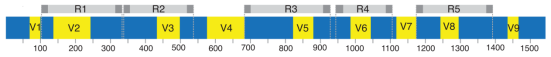 5R 16S擴增16S rRNA基因的5個區(qū)域 灰色R1-R5表示5R 16S擴增的5個區(qū)域