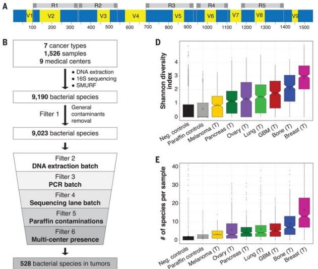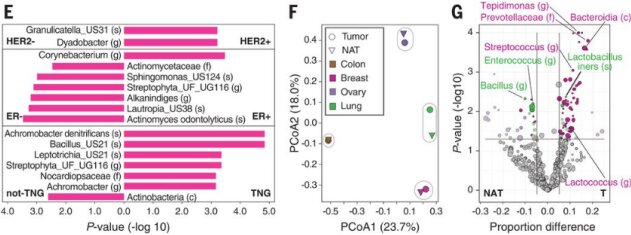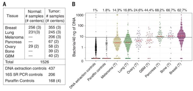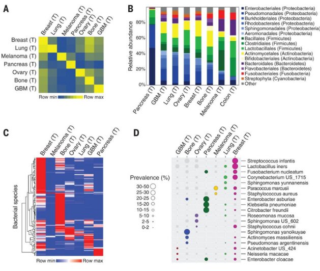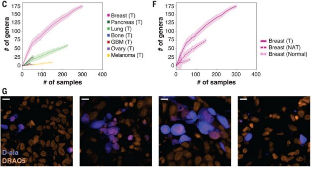 發(fā)現(xiàn),不同的癌癥類型在對細(xì)菌DNA陽性的腫瘤比例上有所不同,從僅14.3%的黑色素瘤到60%的乳腺癌、胰腺癌和骨腫瘤。在與外部環(huán)境沒有直接聯(lián)系的實體腫瘤中也檢測到了細(xì)菌DNA,