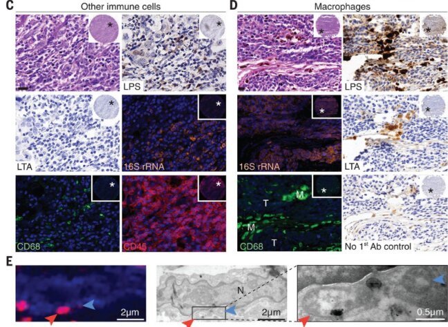 (A)在459、427和354個腫瘤核心中不同細(xì)胞類型中LPS、LTA和細(xì)菌16S rRNA的染色模式總結(jié)。CD45+/CD68+細(xì)胞被稱為巨噬細(xì)胞;CD45+/CD68?細(xì)胞被稱為其他免疫細(xì)胞。(B)細(xì)菌性LPS和16S rRNA在乳腺癌細(xì)胞中出現(xiàn)。(C)細(xì)菌性LPS和16S rRNA在一個高度炎癥的乳腺腫瘤的CD45+/CD68?細(xì)胞中被證實。(D) A型黑色素瘤腫瘤顯示典型的巨噬細(xì)胞相關(guān)菌(M)染色,LPS和LTA染色陽性,但無16S rRNA染色。附近的腫瘤細(xì)胞(T)顯示典型的LPS和16S rRNA染色,LTA染色陰性。每個插圖都顯示了整個核心的低放大倍數(shù)。高倍率圖像中的比例尺,20毫米。(E) CLEM顯示了人類乳腺癌中的細(xì)胞內(nèi)細(xì)菌。IF圖像顯示藍(lán)色為DAPI,紅色為LPS。兩種細(xì)菌用箭頭標(biāo)記。