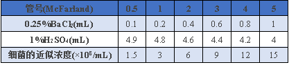 McFarland發(fā)明了一種用于微生物比濁的不同濁度的標(biāo)準(zhǔn)濁度管,具體的配制方法是根據(jù)硫酸和氯化鋇的比例來定的,有表可查(如下表)。