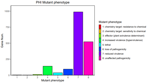 14、PHI注釋:PHI( Pathogen Host Interactions Database),病原與宿主互作數(shù)據(jù)庫,主要來源于真菌、卵菌和細菌病原,感染的宿主包括動物、植物、真菌以及昆蟲。該數(shù)據(jù)庫對尋找藥物干預的靶基因研究有重要作用,同時該數(shù)據(jù)庫還包括抗真菌化合物和相應的靶基因。數(shù)據(jù)庫中的每個基因都包含核酸和氨基酸序列,以及感染宿主過程中預測的蛋白功能的詳細描述。病原體PHI表型突變類型基因數(shù)目的統(tǒng)計如下: