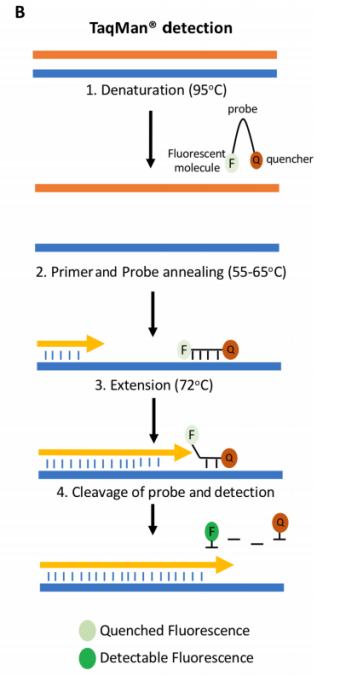 B.TaqMan®探針檢測:TaqMan 探針將引物下游與單鏈cDNA結(jié)合。在延伸過程中,聚合酶會分解探針,由于失去與淬滅劑部分的接近度,從而可以檢測到熒光信號。