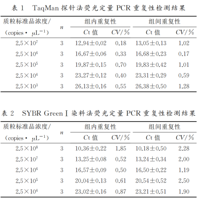 以倍比稀釋的標(biāo)準(zhǔn)品質(zhì)粒作為模板,對本試驗建立并優(yōu)化的2種熒光定量PCR檢測方法進(jìn)行特異性、敏感性和重復(fù)性的驗證及比較。