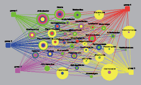 相關(guān)分析方法:采用網(wǎng)絡(luò)分布圖展示不同個(gè)體或人群的腸道微生物分布,可以形象的展示不同個(gè)體或人群之間的相同物種或是OTU的相似、分布情況。