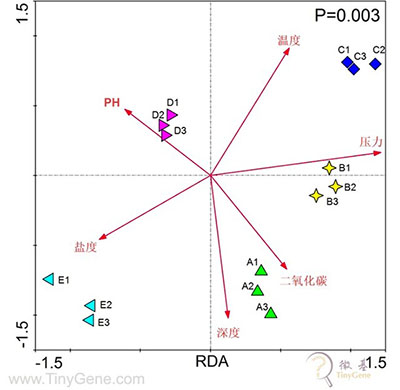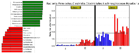 相關(guān)分析方法: 利用冗余分析(RDA)反映在某微生物分類級(jí)別上(如屬)不同個(gè)體腸道菌群差異與健康、藥物、飲食之間關(guān)系。